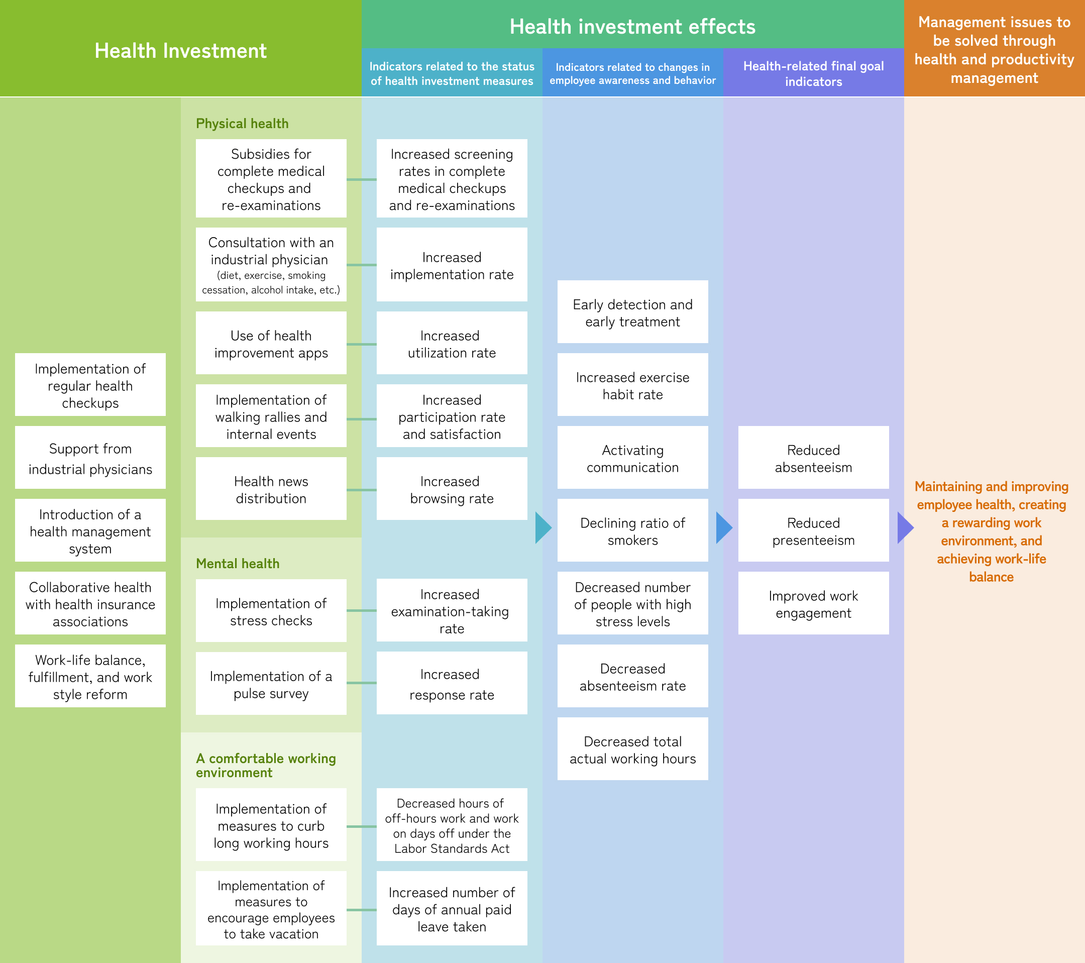We will promote health and productivity management by understanding the management issues we want to solve through health and productivity management, the expected effects, and the connection between specific health promotion activities.