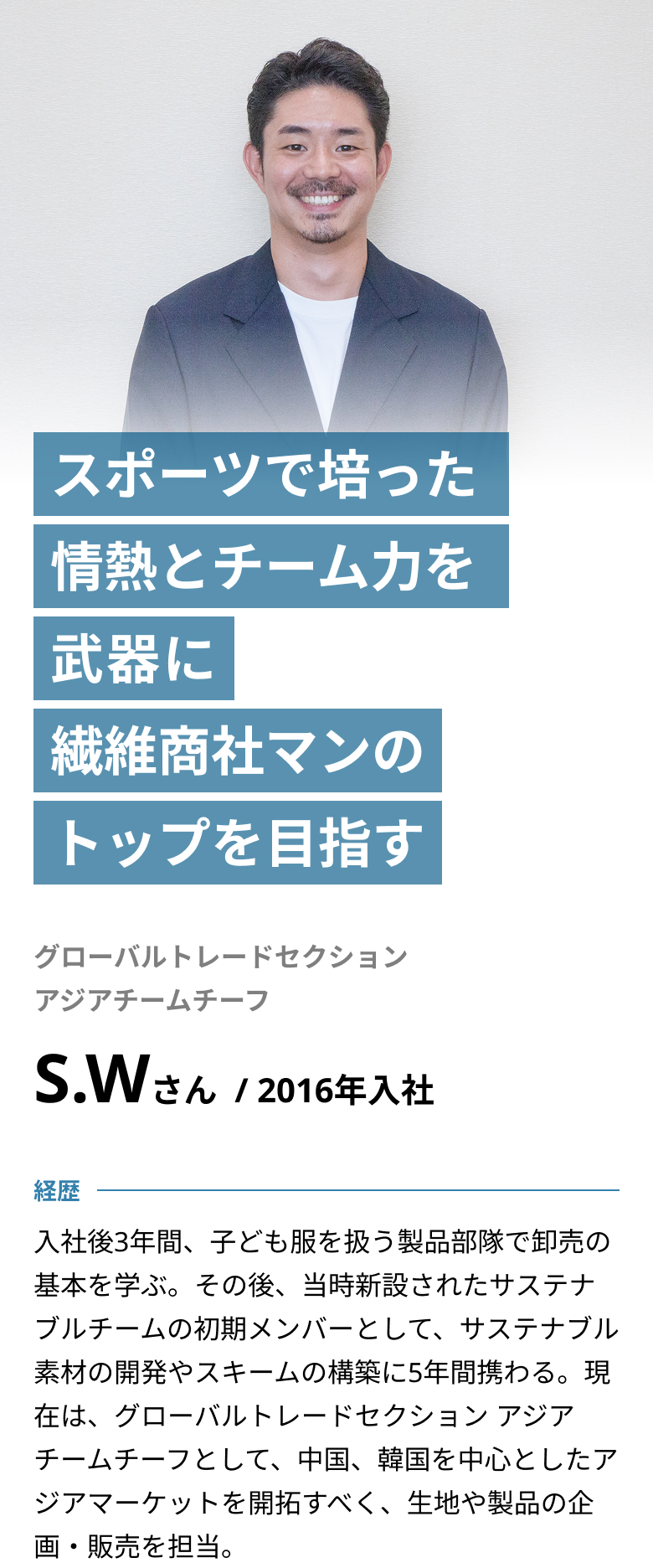 現在はアジアチームのチーフとして、アジア市場の開拓に取り組んでいますが、まずはこのマーケットをしっかり確立させていくことが直近の目標です。アジアはこれから大きな成長が見込まれる市場であり、当社の強みである生地と製品の両輪を生かして積極的に仕掛けていくことで、アジアマーケットでの確かなビジネスの基盤を築いていきたいと考えています。
