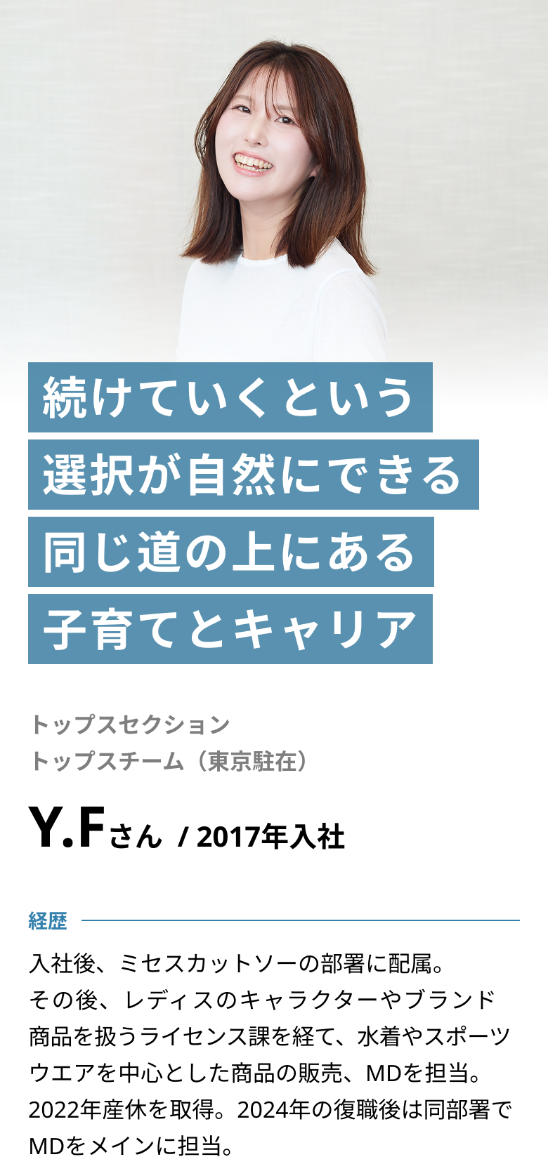 復職にあたって、商談や出張などで帰りが遅くなってしまうと保育園のお迎えに間に合わなくなるのではないかという心配もあり、販売やMDといった営業職がこのまま続けられるのか、事務職に転向した方がいいのではないかと、正直とても悩んでいました。そんな中で復職前に上司と面談する機会があり、不安に思っていること全てを率直に伝えたら、「育児をしながら、出張の少ないお客さまを担当するなど、工夫して営業職を続けている先輩ママがいるよ。まずは在社でできる企画業務の比率を上げてやってみたらどうか。もし課題が出てきた時は、一緒に考えていこう」と声を掛けていただき、その言葉にとても救われました。