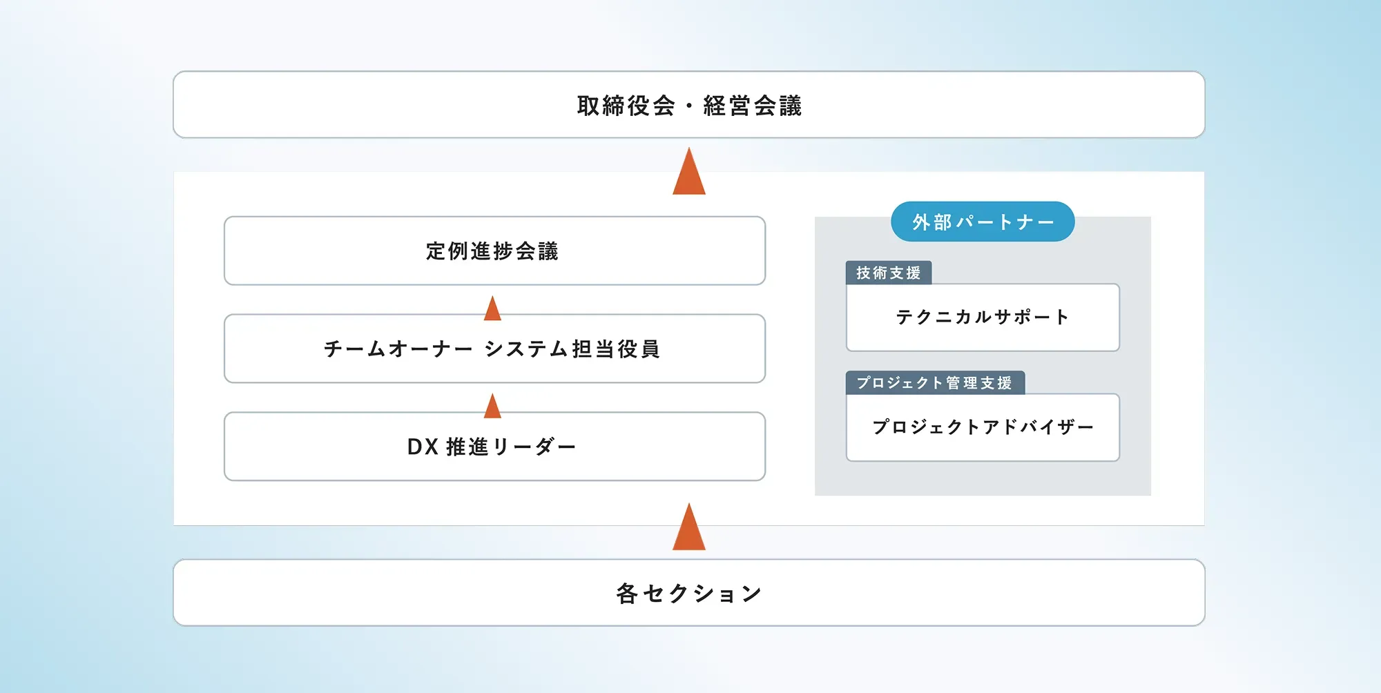 外部パートナーとの強力なパートナーシップにより、専門的な知見とサポート体制を確保し、技術支援とプロジェクトアドバイスを通じた、DX施策の確実な実行を図っています。