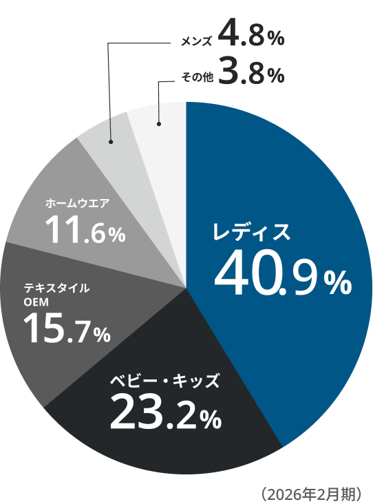 レディスを主体として、多岐にわたって商品展開をしています。年々、販路も拡⼤し続けています。
